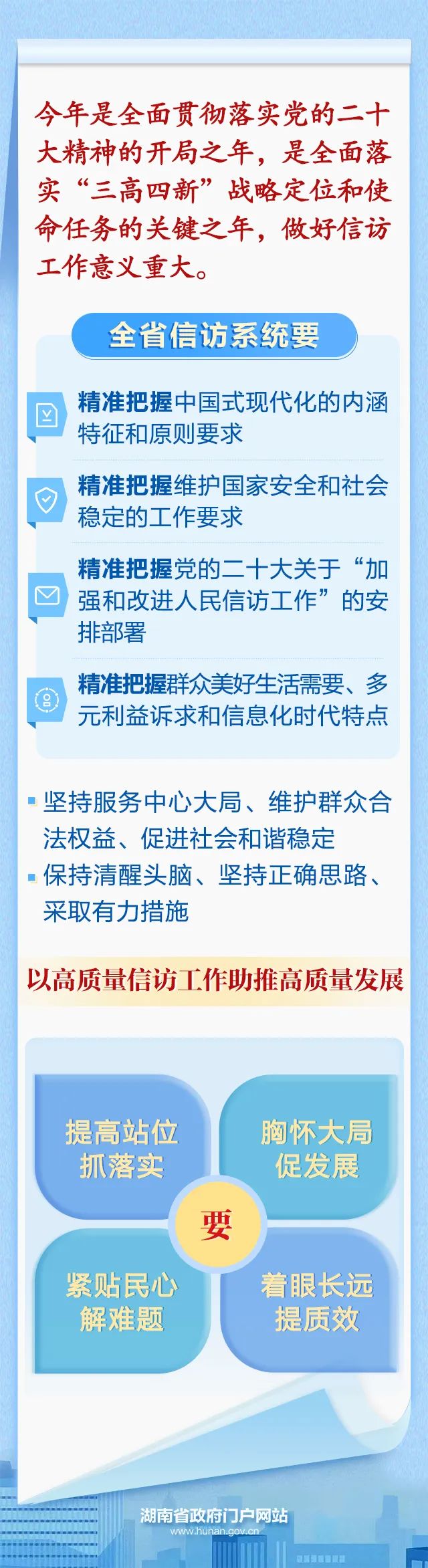 365bet在线注册全省信访系统要精准把握中国式现代化的内涵特征和原则要求,精准把握维护国家安全和社会稳定的工作要求,精准把握党的二十大关于“加强和改进人民信访工作”的安排部署,精准把握群众美好生活需要、多元利益诉求和信息化时代特点,坚持服务中心大局、维护群众合法权益、促进社会和谐稳定,保持清醒头脑、坚持正确思路、采取有力措施,以高质量信访工作助推高质量发展。
