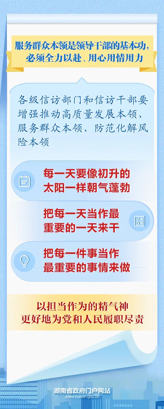 各级信访部门和信访干部要增强推动高质量发展本领、服务群众本领、防范化解风险本领,每一天要像初升的太阳一样朝气蓬勃,把每一天当作最重要的一天来干,把每一件事当作最重要的事情来做,以担当作为的精气神更好地为党和人民履职尽责。